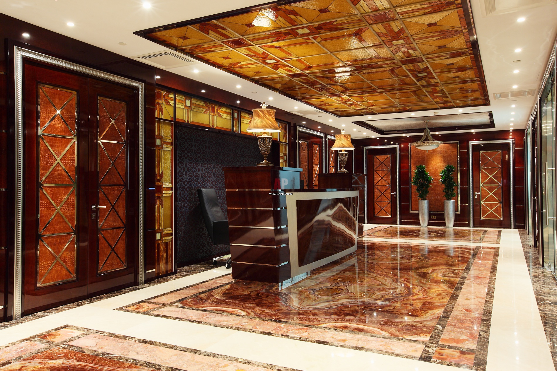 Стойка ресепшен занимает центральное положение в помещении. Она выполнена по эскизам архитекторов из шпона эвкалипта под лаком. В ее облике заметны черты египетского стиля.