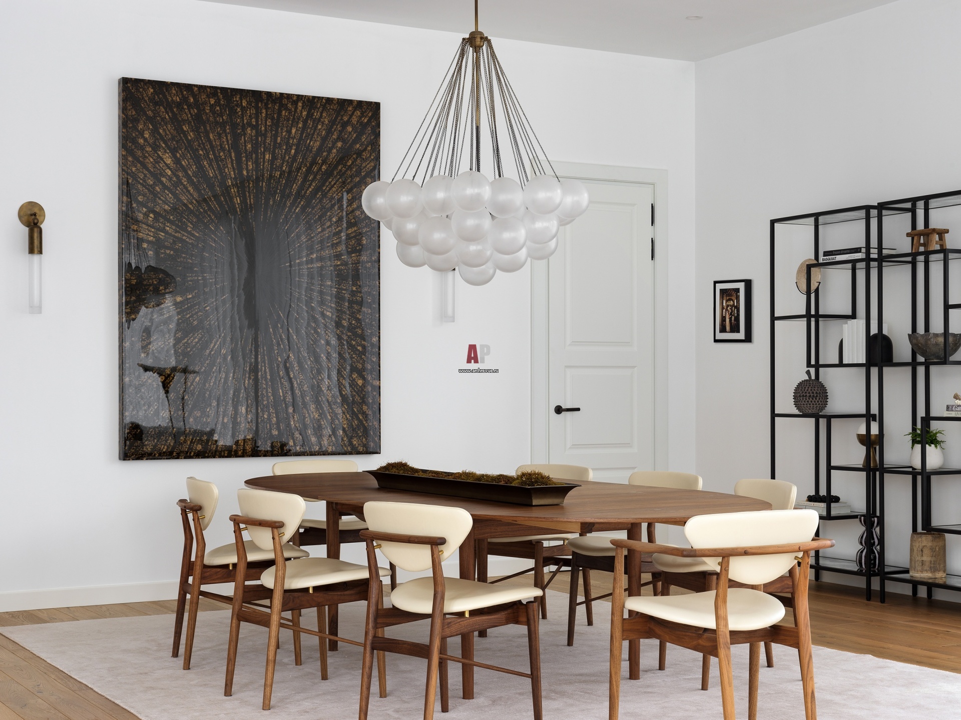 Парадная столовая. Стол и стулья, House of Finn Juhl. Люстра, Apparatus. На стене – работа Black Starburst Гэвина Перри, привезенная с ярмарки Art Basel.