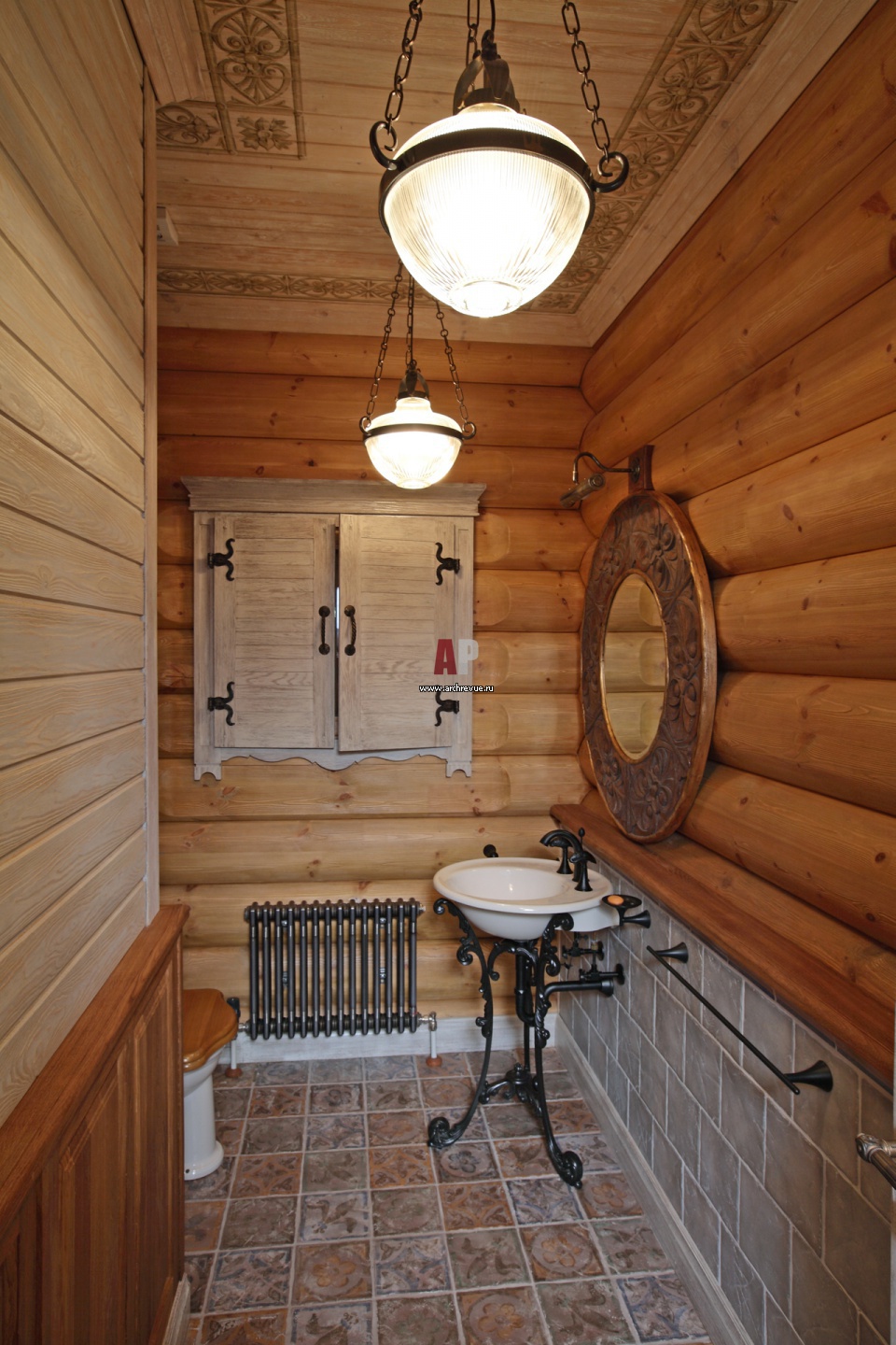 Интерьер гостевого санузла в деревянном доме. Кованая мебель зрительно облегчает интерьер. Потолки зашиты доской, которая расписана вручную.