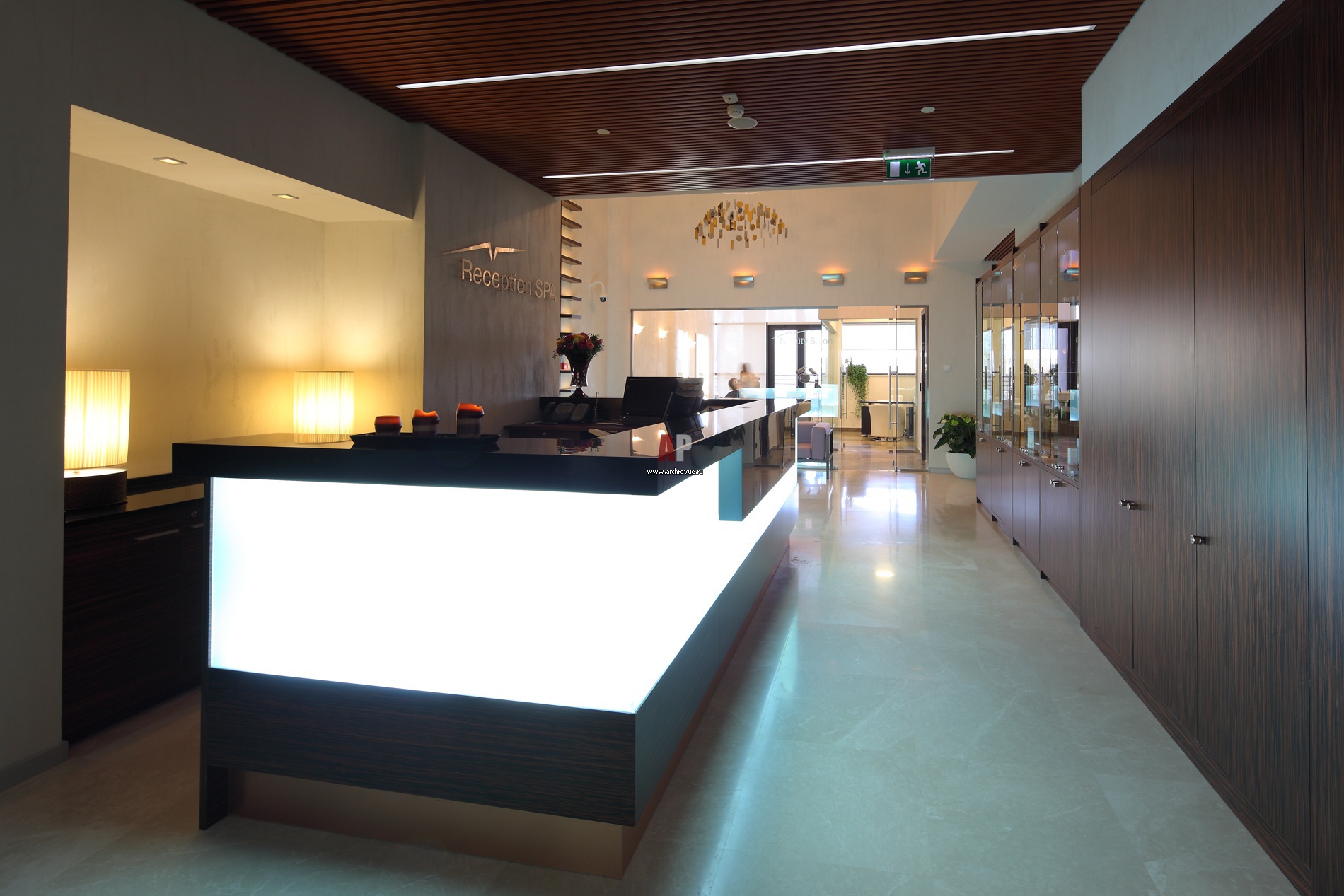 Зона ресепшен на входе в SPA-центр. Стойка ресепшен зашита стеклянными панелями со встроенной светодиодной подсветкой.
