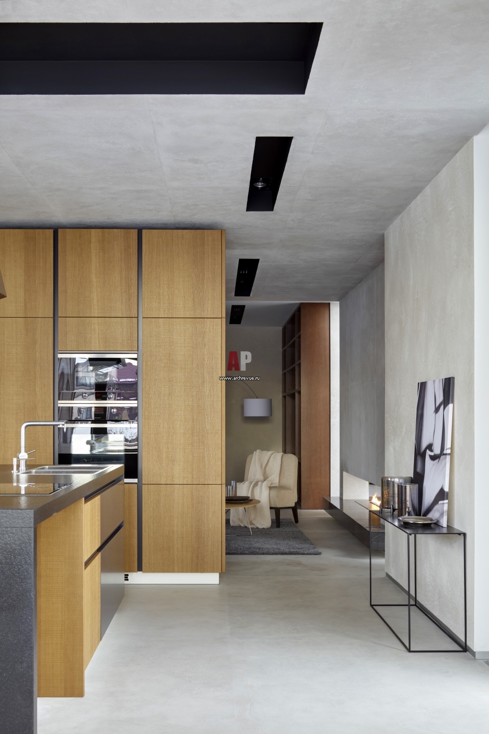 Двухэтажный дом с элементами индустриального дизайна. Вид из кухни на медиазону и камин.