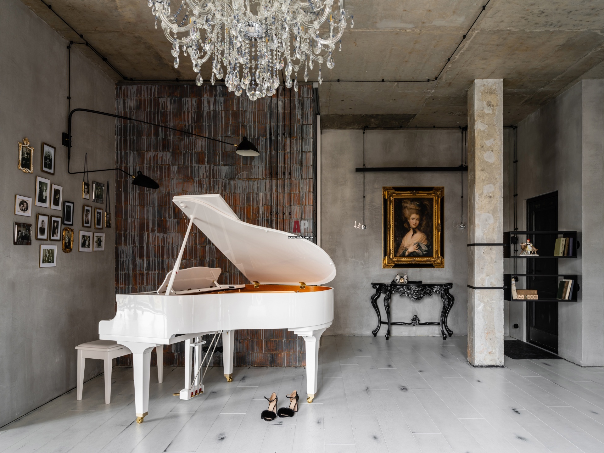Небольшая прихожая отделена от общей гостиной металлическим стеллажом. Входная дверь оформлена панелью с эффектом старения. На полу – чугунная плита весом 30 кг. Консоль, Prestige. На д ней – репродукция картины Томаса Гейнсборо «Дама в голубом», оригинал которой хранится в Эрмитаже. Бра, Ligne Roset.