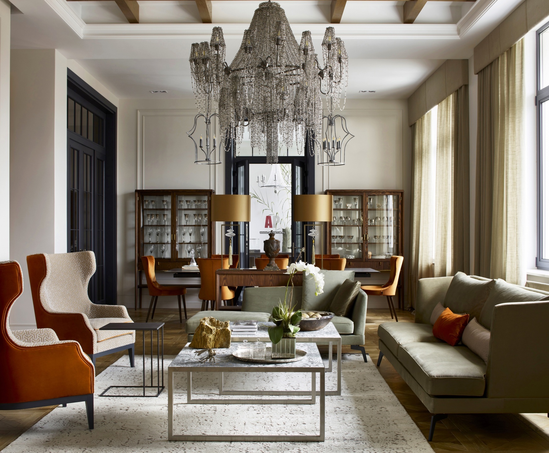 Зона отдыха в гостиной. Диваны, кресла, журнальные столики, Furman. Консоль, витрины, Dantone Home. Центральная люстра, на заказ.
