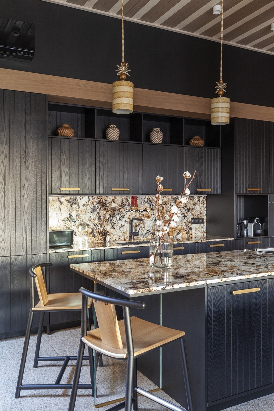 Кухня черная. «Я изначально мечтала именно о черной кухне, - отмечает дизайнер. – Ее фасады выполнены из тонированного дуба и за счет ритмичного рисунка выглядят очень нескучно и динамично».