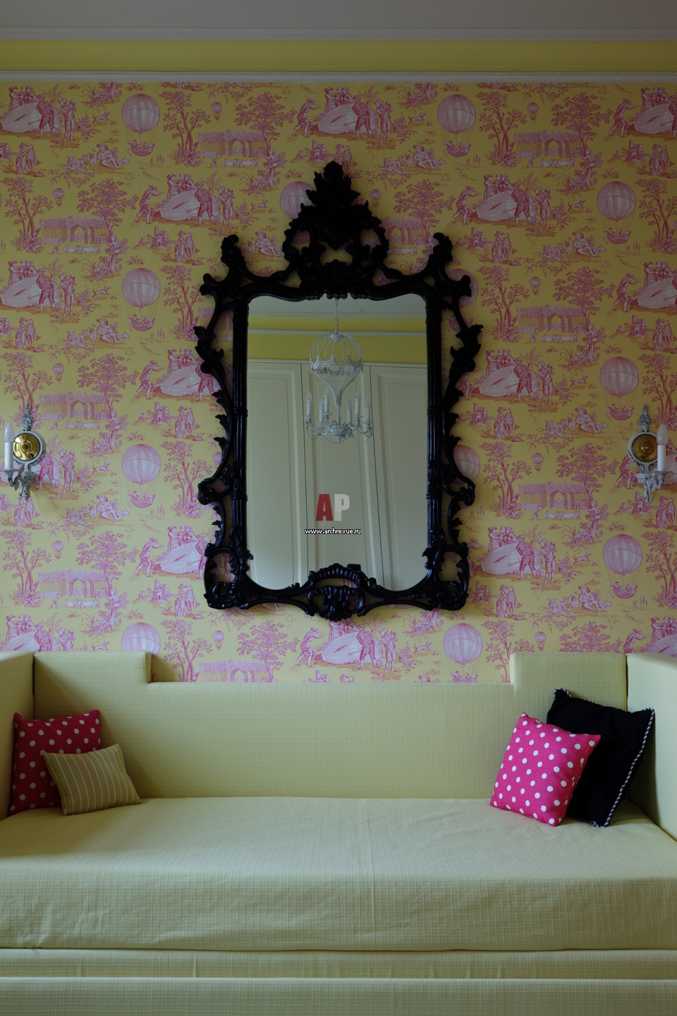 Фрагмент детской. Обои Charles Burger с изображением полета на воздушном шаре в сложной розово-желтой гамме. Диван на заказ.