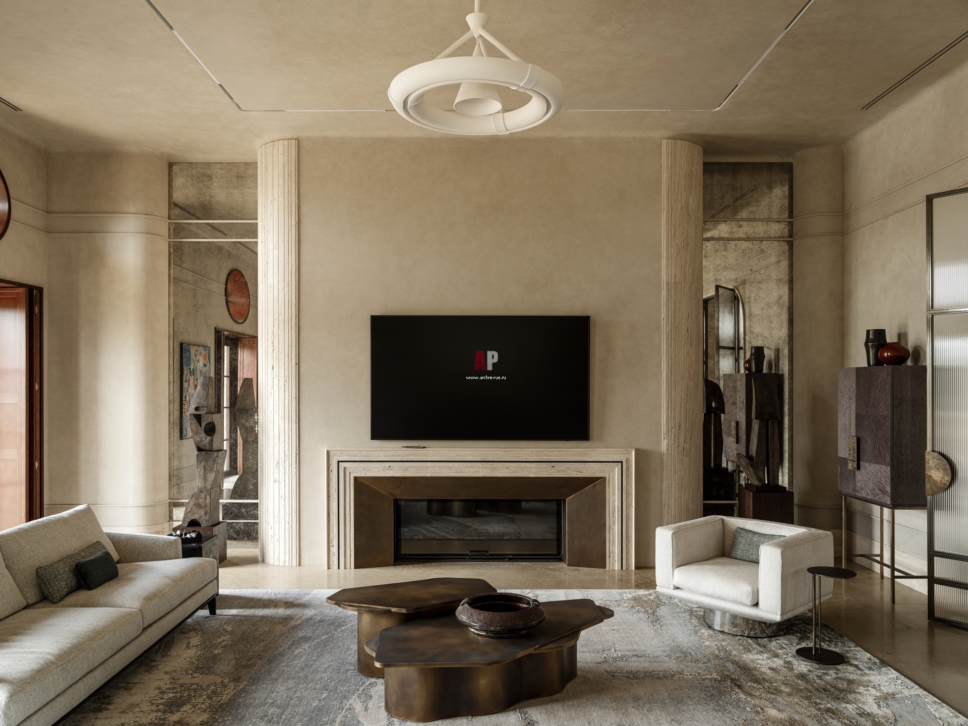 Гостиная. Диваны, Poliform, модель BellPort. Кресло, Minotti, модель Sally. Приставной столик у кресла, Cattelan Italia, модель Sting Brushed. Журнальные столики, по авторским эскизам, латунь. Люстра, Alexandre Loge, модель Odissea.