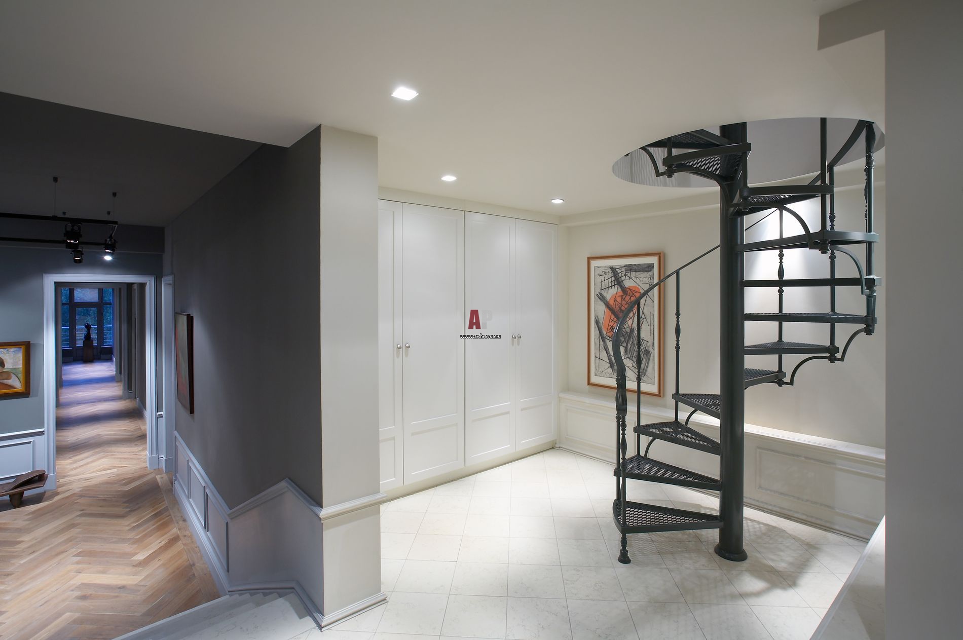 Из прихожей открывается захватывающая перспектива: анфилада помещений (без дверей). Она заканчивается высоким окном и выходом на террасу. Справа от входа находится винтовая кованая лестница на второй уровень.