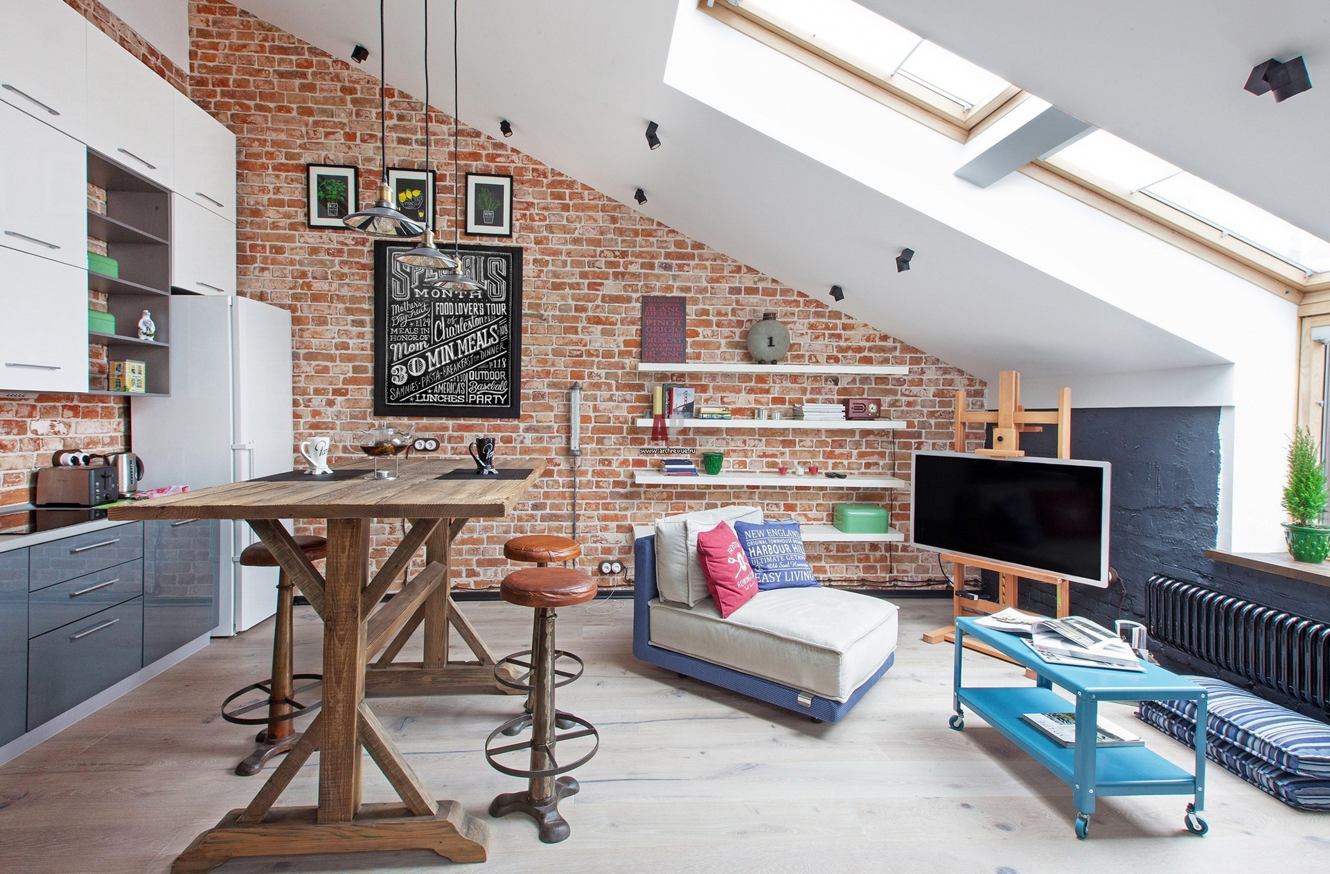 Фото интерьера лофта площадью 39 кв. метров в здании бывшей фабрики в Москве. Задача дизайна – передать атмосферу творчества в свободном пространстве. Единое помещение хорошо освещено благодаря двум мансардным окнам с рулонными шторами от VELUX.