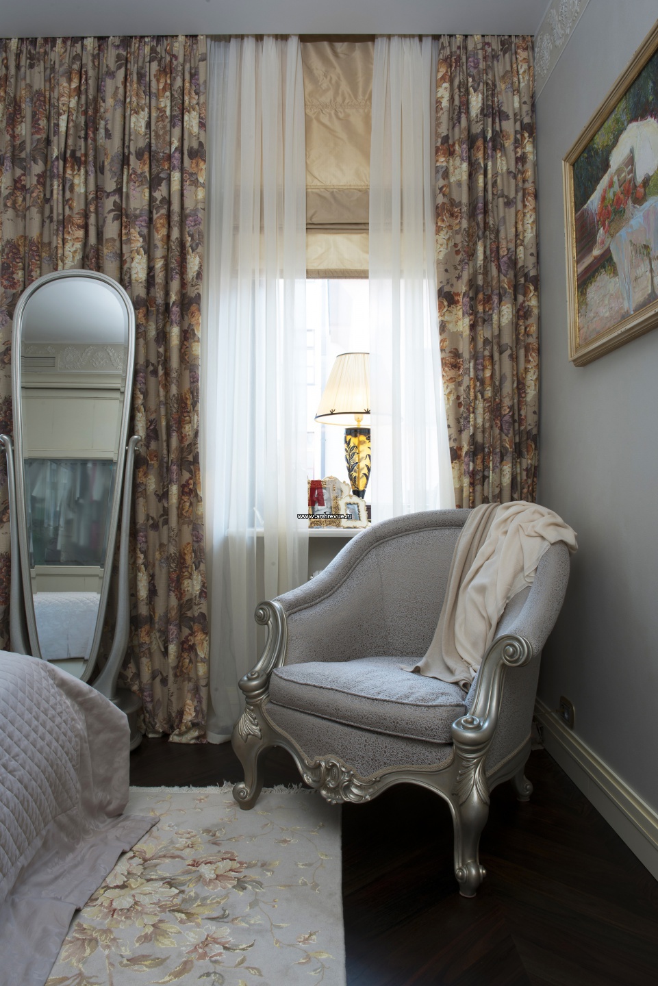 Интерьер спальни с золотистыми нотами. Овальное напольное зеркало в стиле современная классика. Паркет, палисандр, поставщик «Мир Паркета».