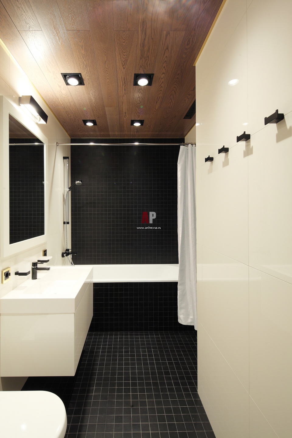 Интерьер ванной комнаты в черно-белых тонах. Пол, фасад ванны, стена выложены черной плиткой. С ней контрастирует белая мебель и санфаянс. Сантехника, Duravit.