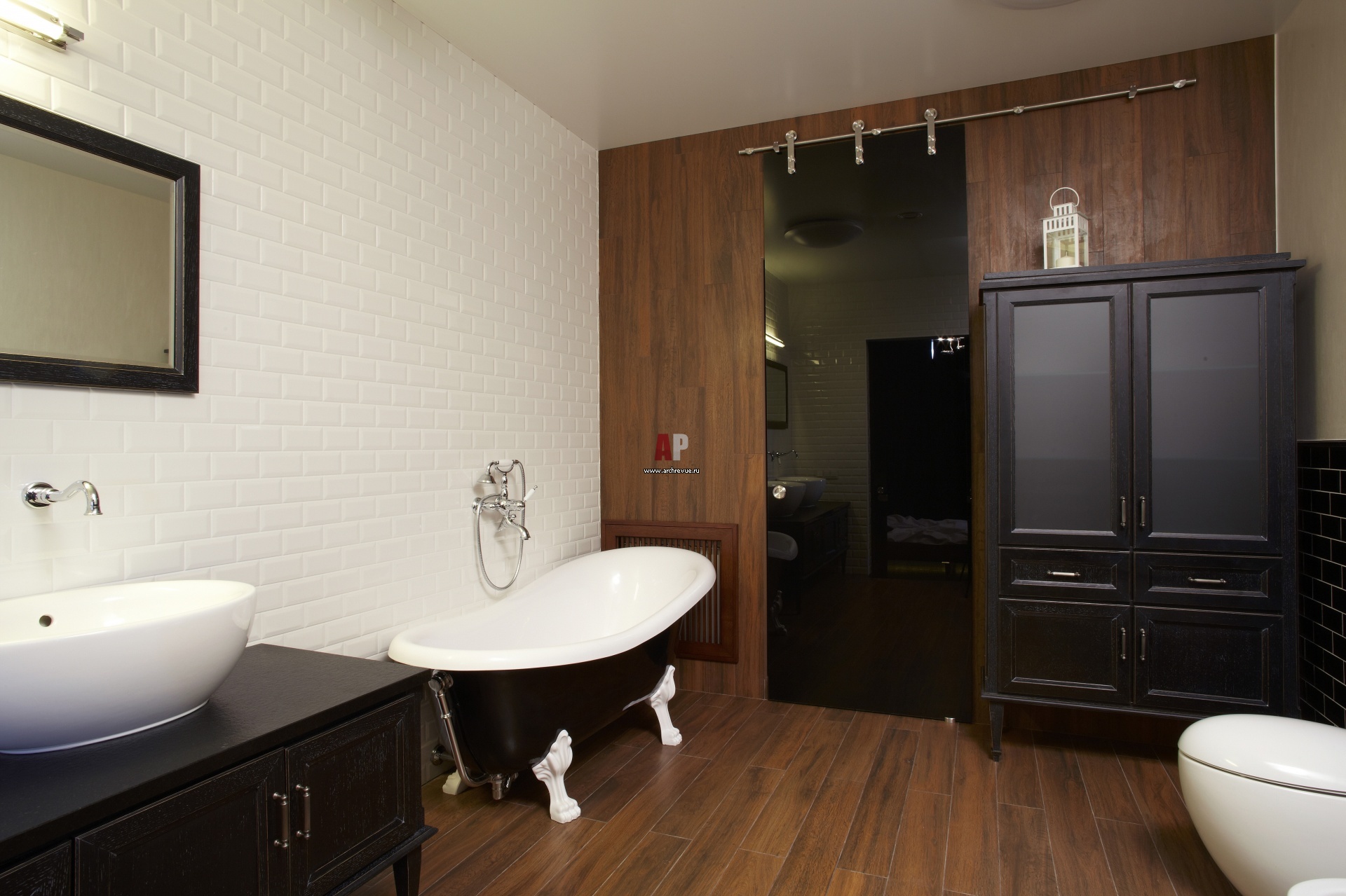 В оформлении хозяйской ванной использованы стеновые панели из шпона ореха, черное стекло и белая плитка-кабанчик.