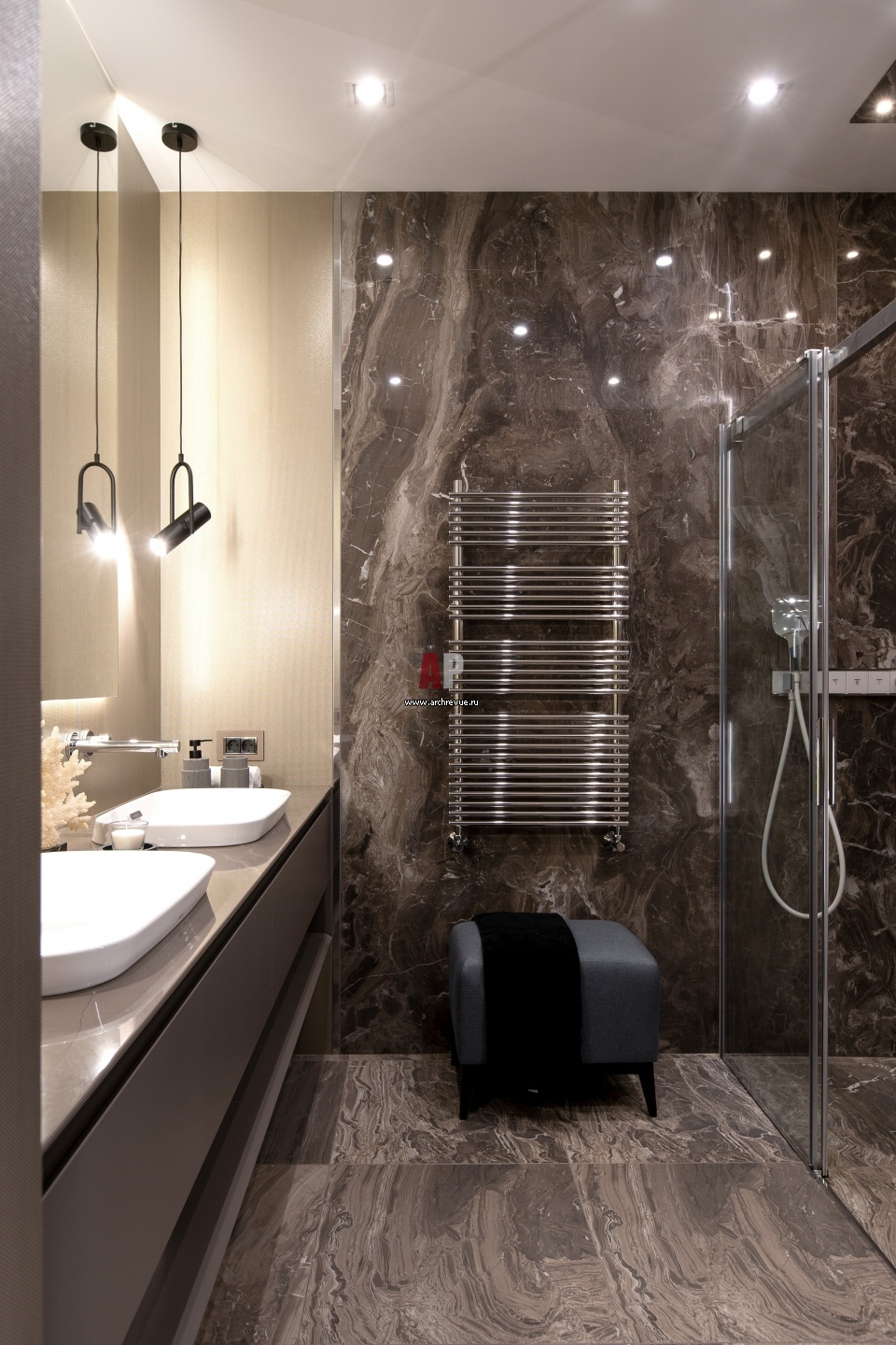 Душевая в мастер-блоке имеет более спокойное настроение и выдержена в нейтральных тонах. Использован керамогранит Rex в сочетании с перфорированными золотыми панелями Laminam.