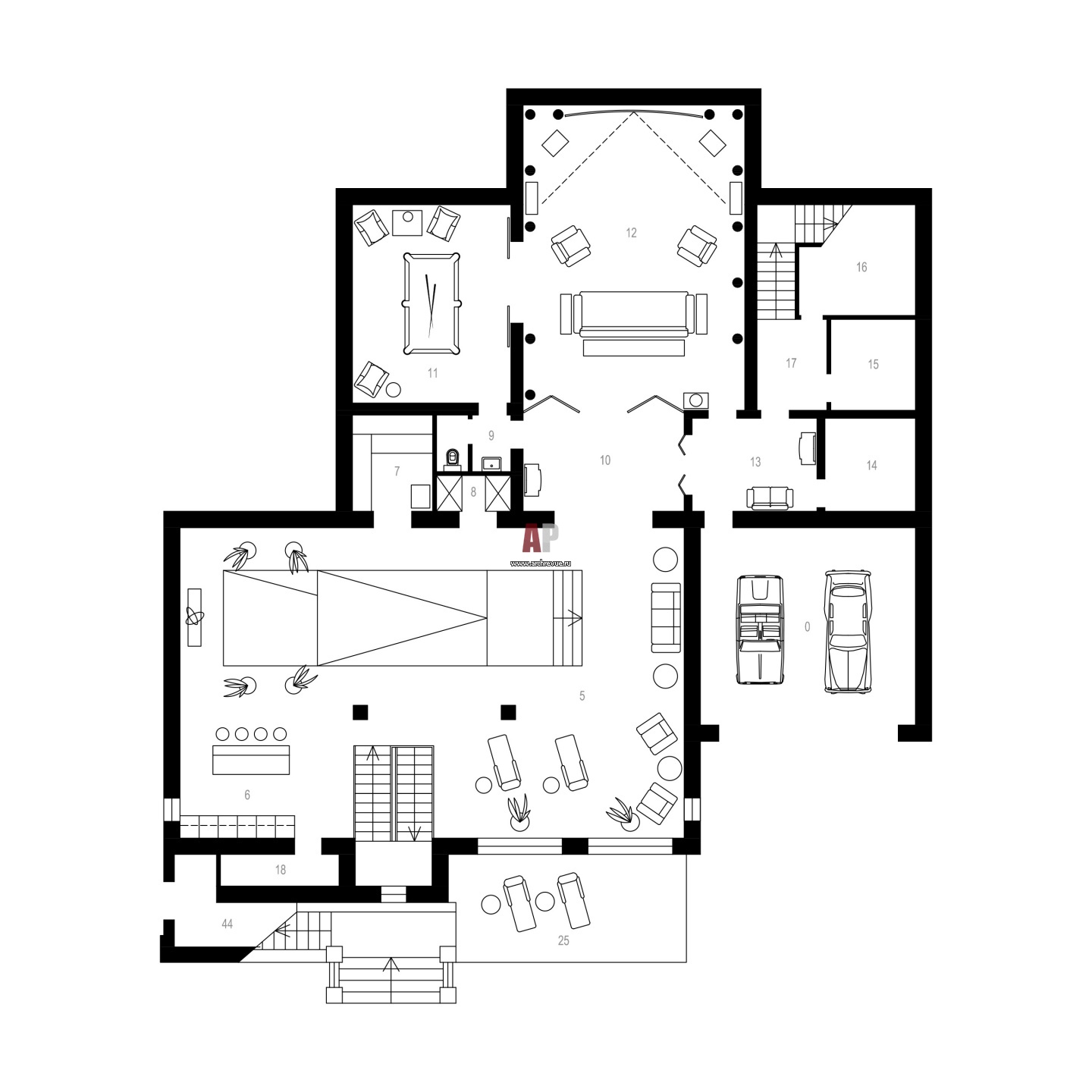 Планировка эксплуатируемого цоколя 4-х этажного особняка в классике.