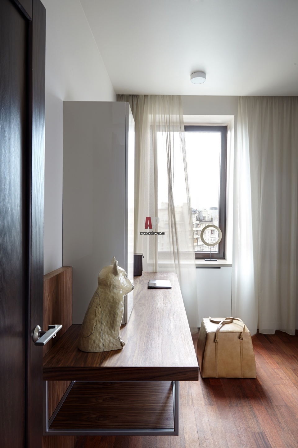 Интерьер кабинета в современной квартире. В квартире практически нет пустых стен, каждая плоскость используется в качестве места хранения.