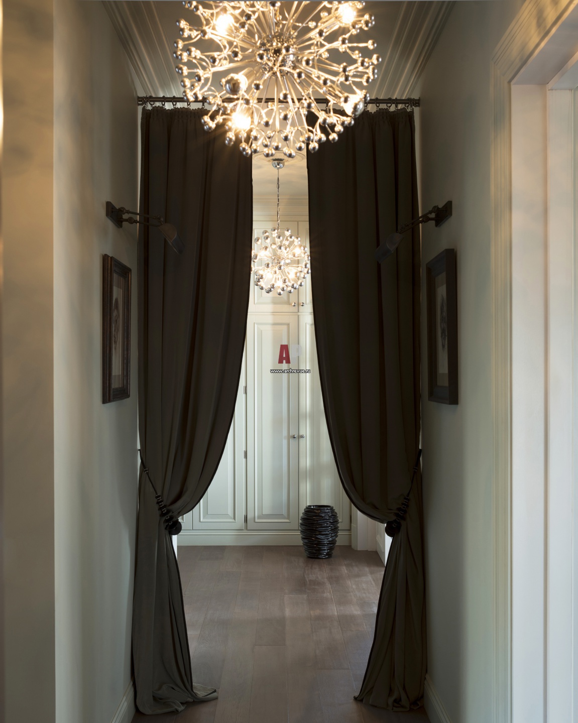От парадного холла прихожая отделена гардинами из плотной темной ткани.