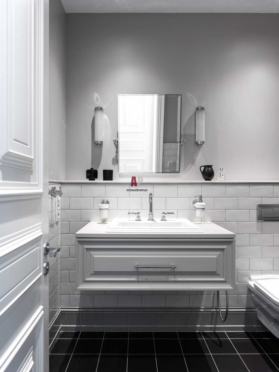 Детский санузел сделан белым. Настенная плитка, Ceramiche Grazia. Раковина, унитаз, Villeroy & Boch, модель Hommage. Подвесная тумба изготовлена на заказ. Смеситель для раковины, Bossini, модель Liberty. Зеркало, светильники, Devon & Devon.