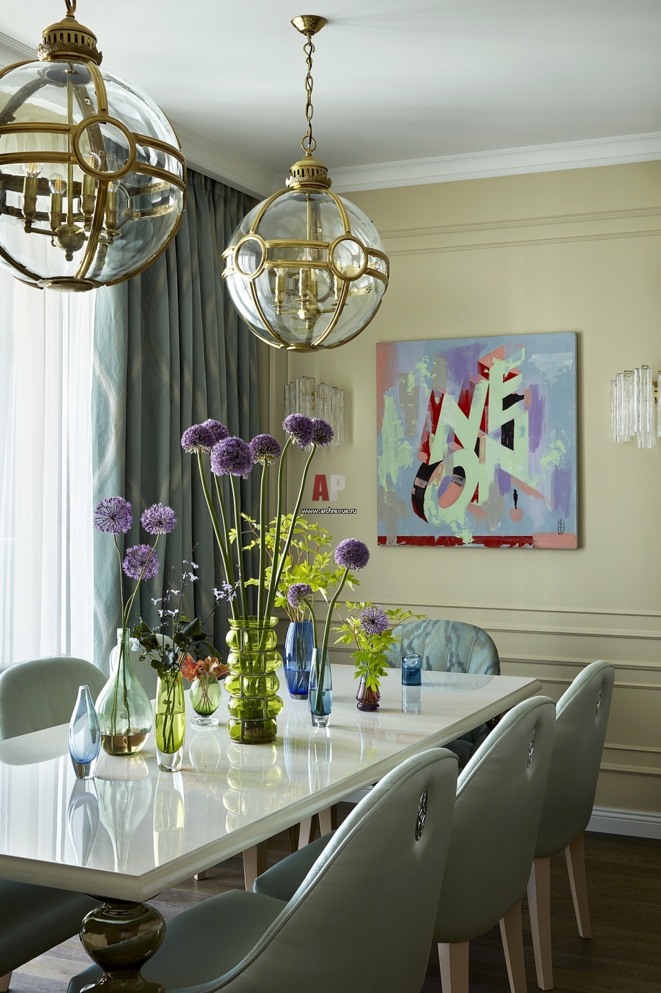 Столовая с декоративными акцентами синего и лаймовго цвета. Картина Neon художника Klazki. На столе – винтажные стеклянные вазы.