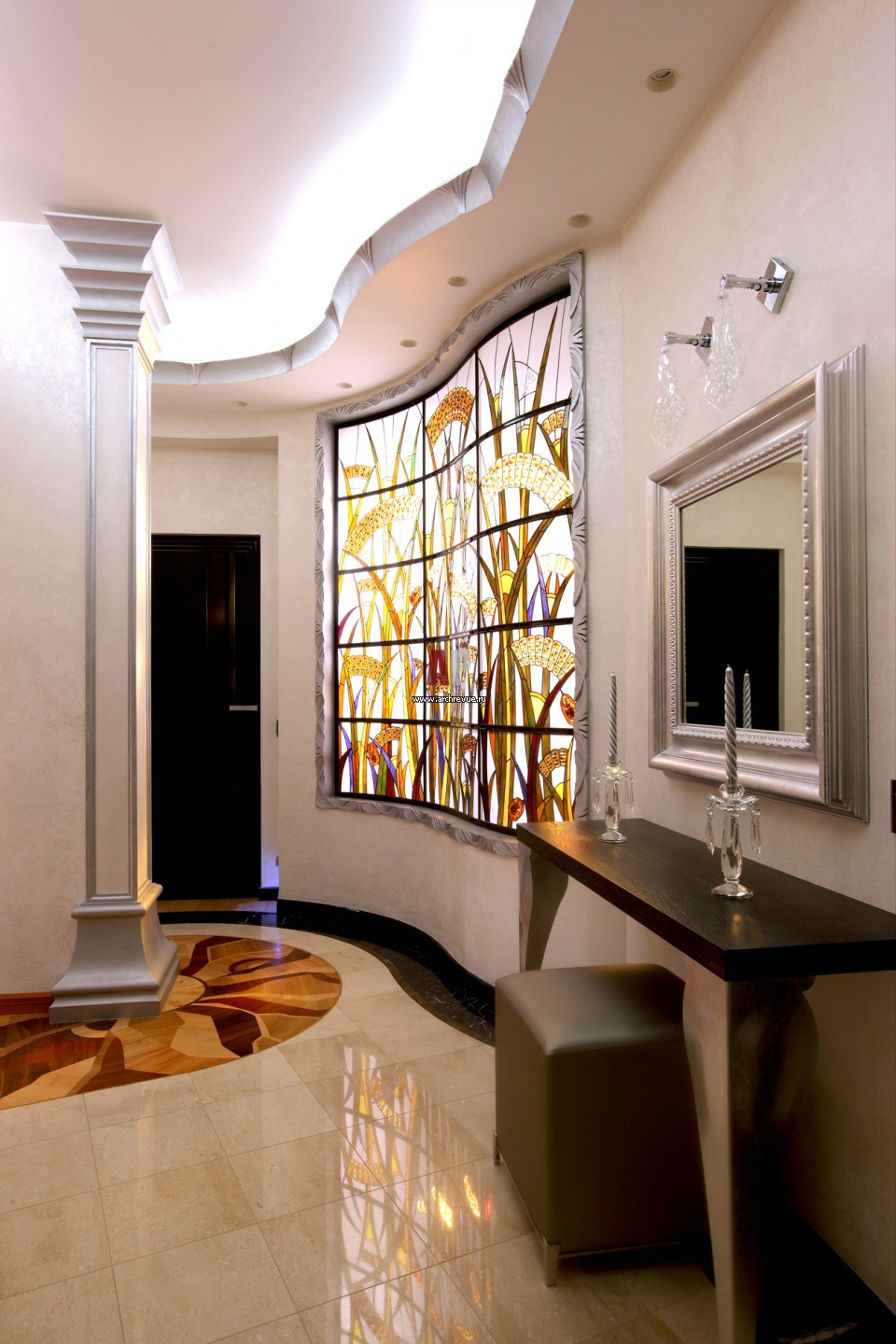 Прихожая в стиле ар-деко. Пластику стен подчеркивает лепной декор, оформление пола и авторский витраж.