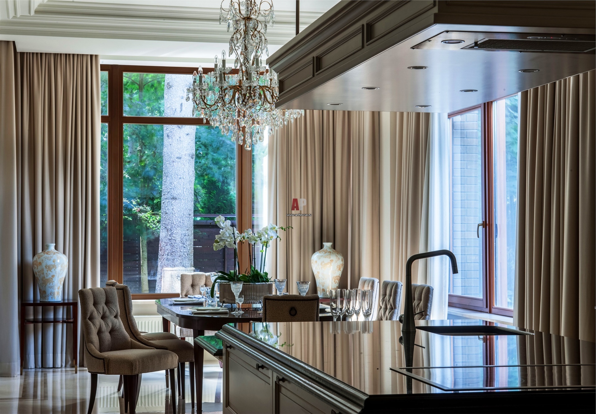 Дом в стиле американской классики на Рублево-Успенском шоссе. Интерьер кухни-столовой.