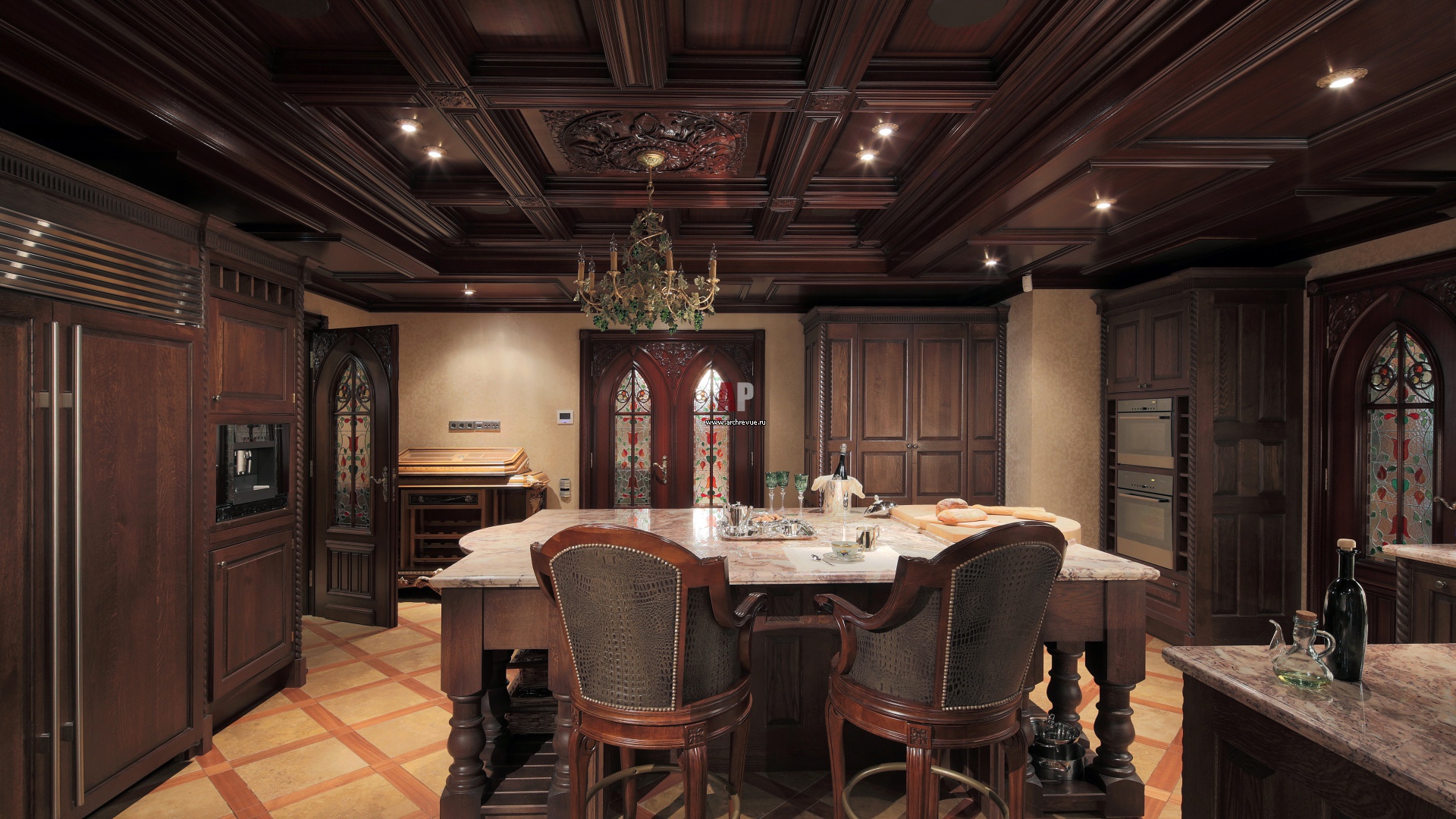 Интерьер винного погреба выдержан в стилистике рыцарского замка. Этому способствует панелирование и встроенная мебель из темного дерева, а также остроконечные вертикальные цветные витражи.