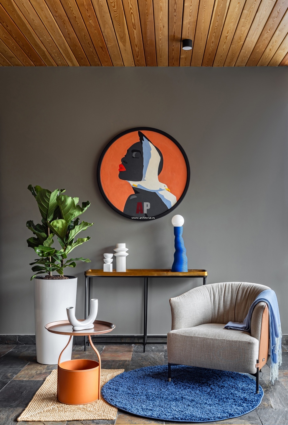 Холл ведет в СПА-зону. Акцентный элемент, в котором зашифрована теплая колористика интерьера, – круглый портрет темнокожей красавицы в стиле поп-арт.