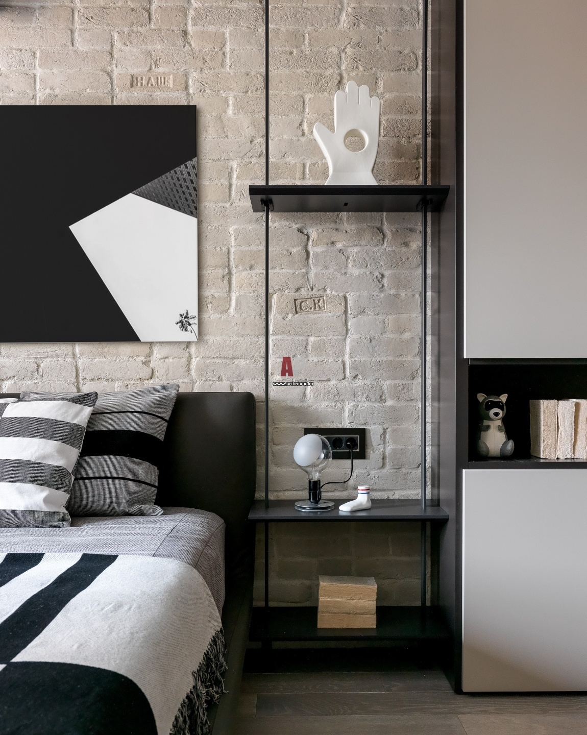 Интерьер комнаты сына-студента. Прикроватный светильник, Flos. На стене над кроватью – фотопанно, художник Алексей Тудаков.
