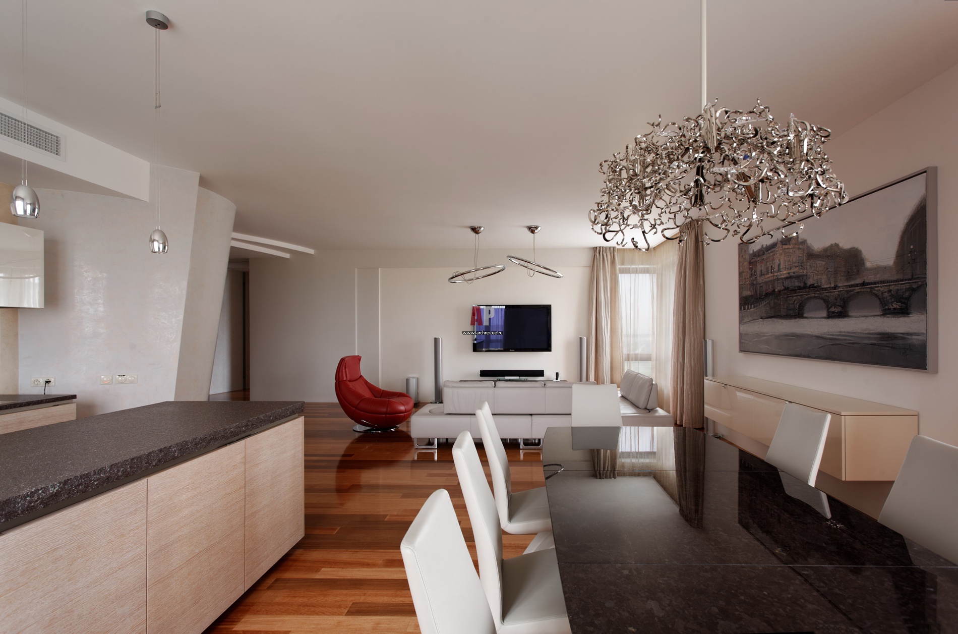 Кухня оснащена островным блоком. Мебельный гарнитур Minotti.