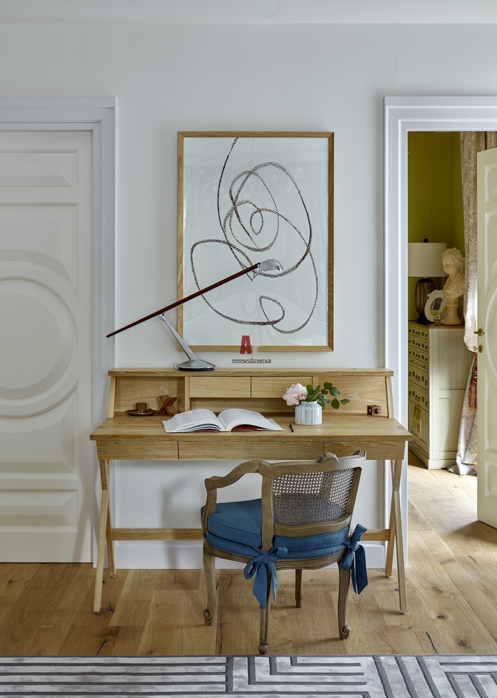 Рабочая зона в спальне. Секретер, Riva 1920. На стене – абстрактная работа Светланы Хомяковой. Справа – вход в гардеробную.