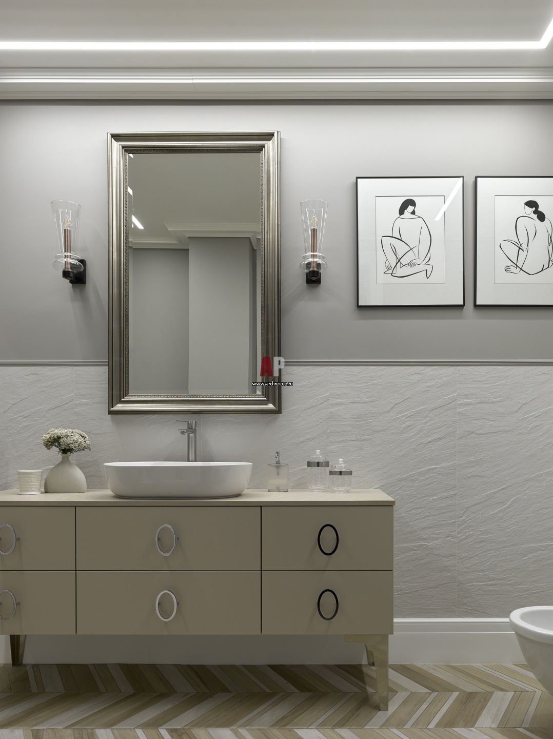 Ванная комната дочери. Раковина и подвесная тумба, Arbi. Бра, Italamp. Унитаз, Duravit. Плитка, Revigres и Provenza. Графика – художник Лилия Ковган.