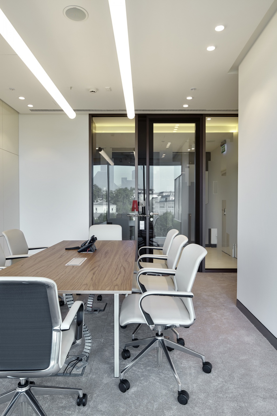 Интерьер переговорной в современном офисе. Силуэт города повторяется в рисунке матирующей пленки на стеклянных дверях переговорной.