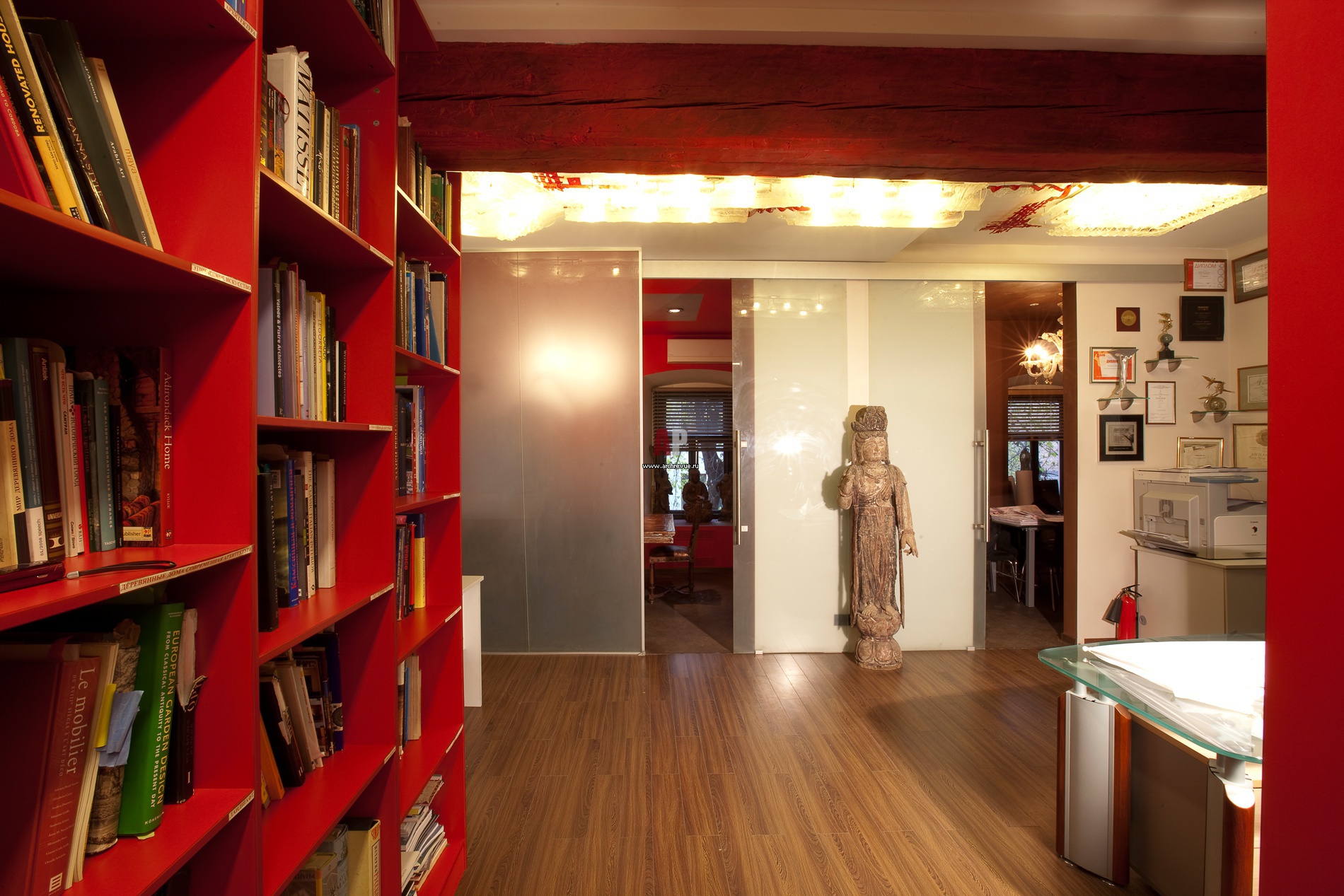 Вид о стороны рабочей зоны на переговорную и кабинет руководителя. Помещения отделены наклонными стеклянными перегородками Dorma . Между входами – китайская храмовая скульптура, изображающая ученицу Будды.