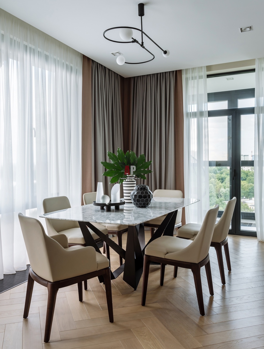Зона столовой. На полу – инженерная доска, светлый дуб, Coswick. Обеденный стол с каменной столешницей.