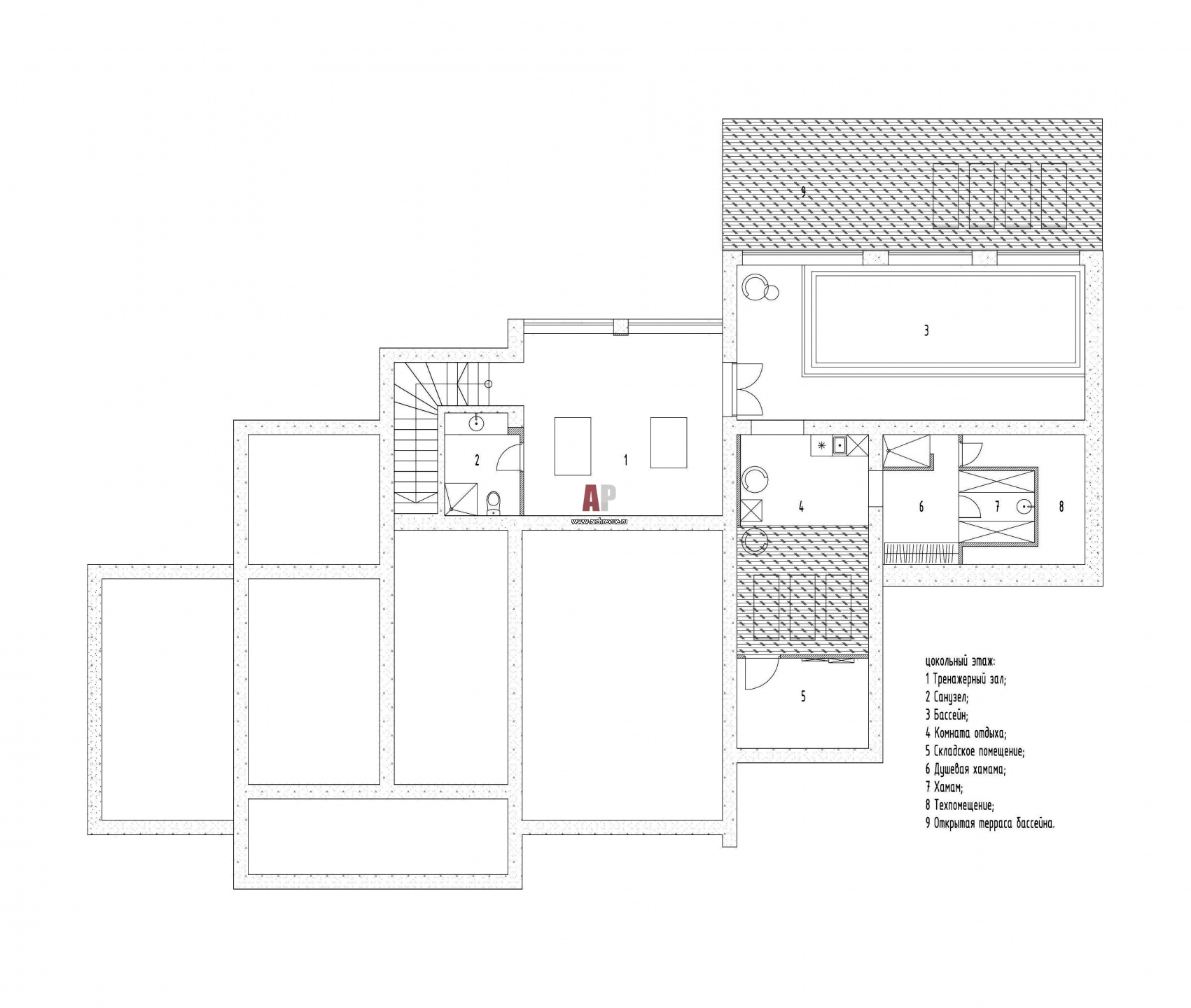 План цокольного этажа трехэтажного шале в Подмосковье. Общая площадь - 650 кв. м.