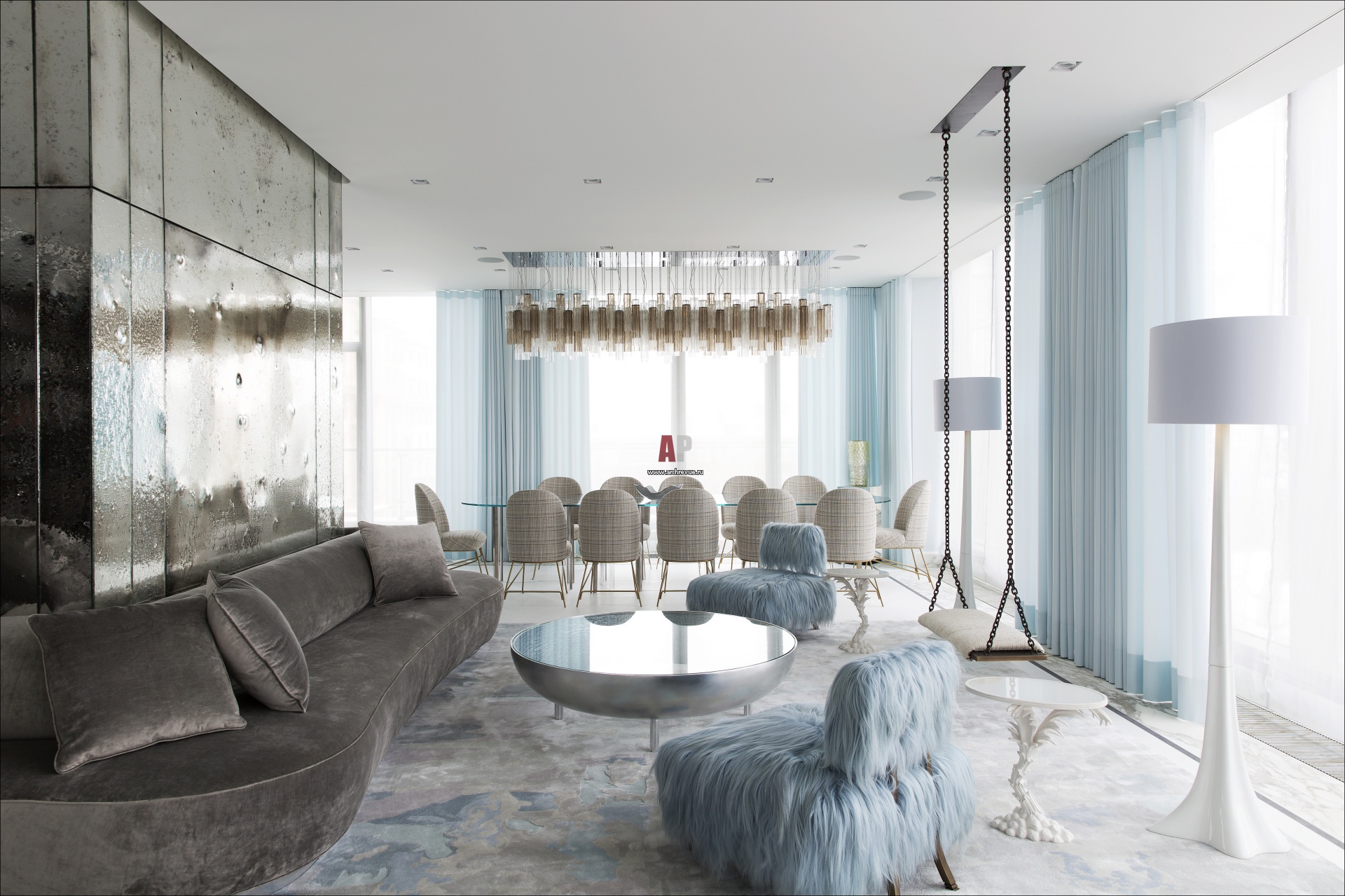 Интерьер гостиной выглядит уточненным и эстетским. Диван биоморфной формы, Vladimir Kagan. Журнальный и кофейный столики, кресла в меховой обивке, Francis Sultana. Качели, Pouenat, по эскизам дизайнера. Столовая стол из стекла и акрила, стулья, Jaime Hayon. На полу – мрамор с сатинированной поверхностью. Стена из фактурного стекла с серебряной амальгамой. Люстра по эскизу дизайнера.