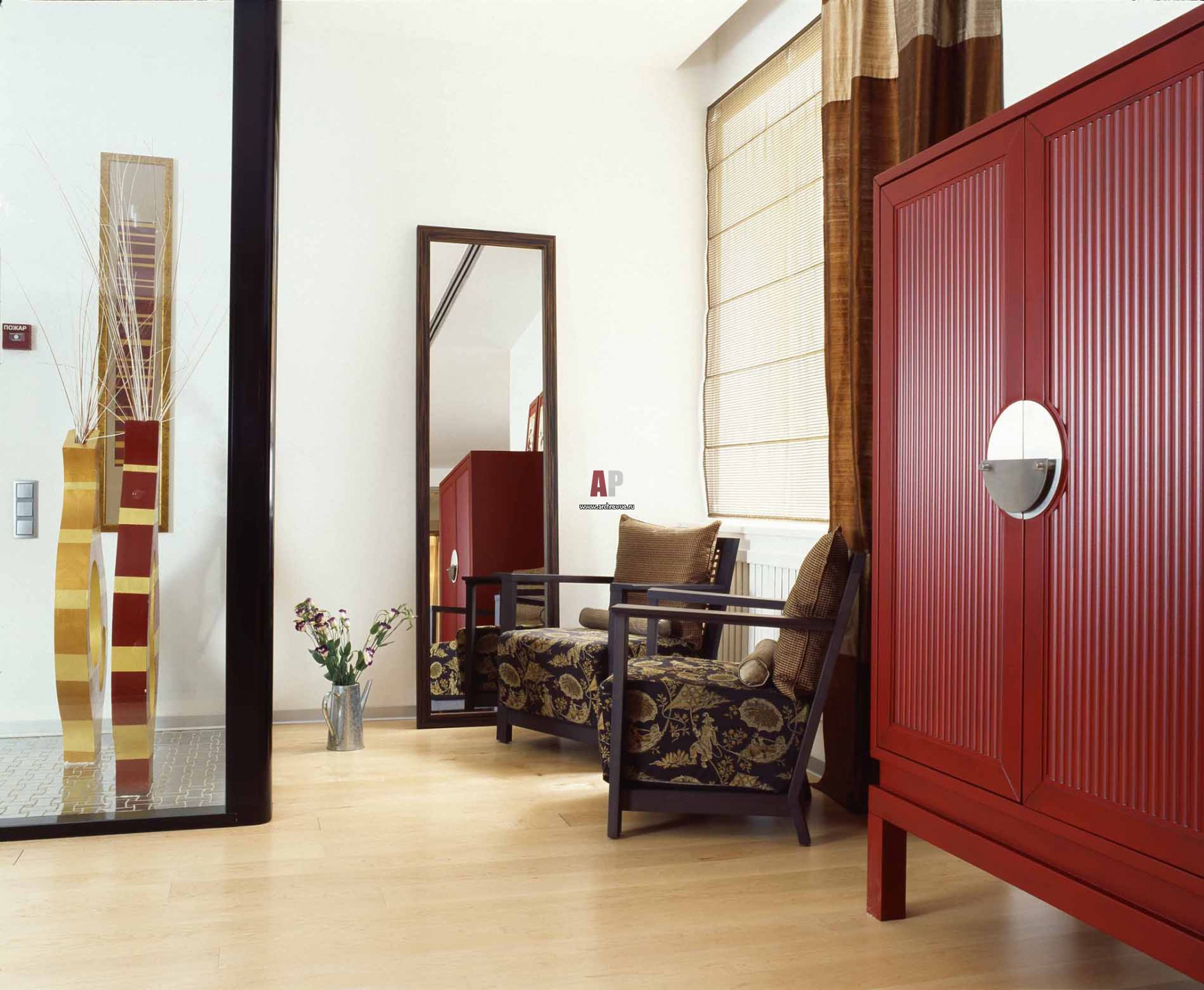 От основного пространства тамбур отделен стеклянными перегородками. Рядом с ними находится приемная. Комод в китайском стиле играет роль гардеробной.