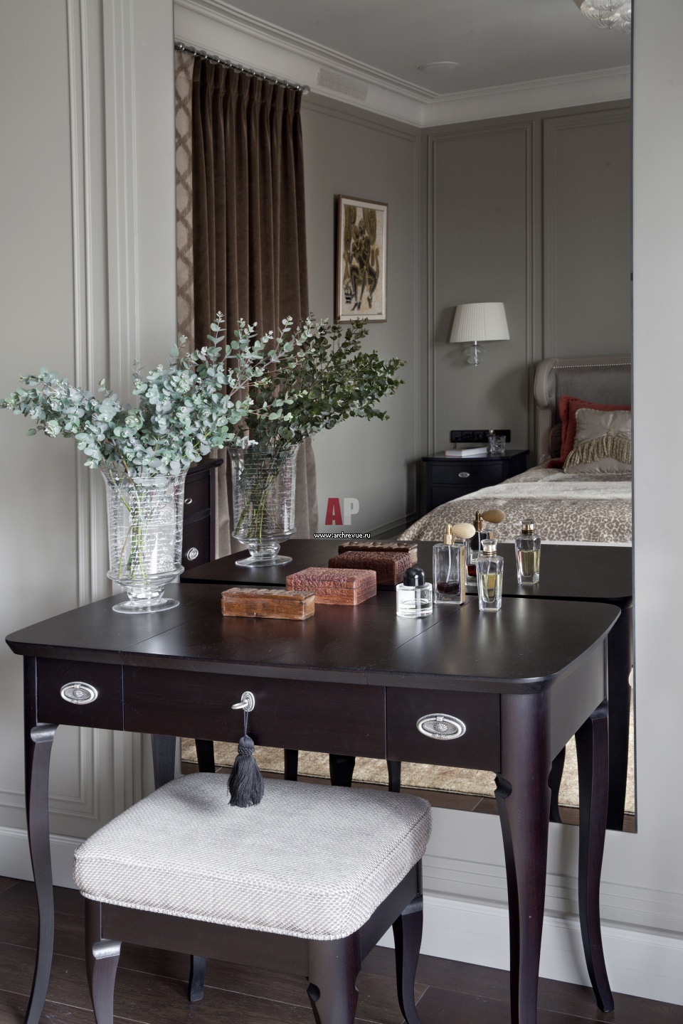 Интерьер спальни с элементами ар-деко. Туалетный столик, Galimberti Nino – поставщик «Москва-Рим». Большое зеркало наклеено на стену, без рамы. Обрамлением служат лепные гипсовые молдинги в раскладке стен.