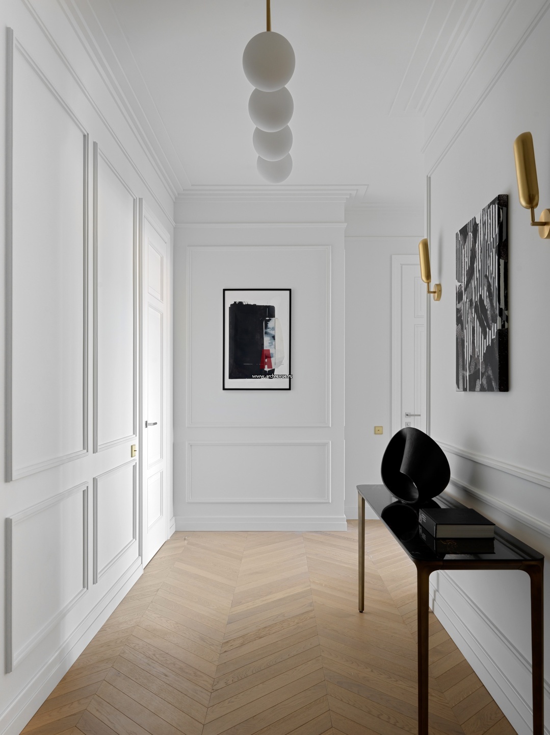 Центральный холл, соединяющий приватные и общие помещения. Консоль, Sovet Italia. Люстра, Menu. Бра, Aromas del Campo. Картина прямо по коридору Алексея Кузнецова; над консолью – работа Кирилла Ашестина.