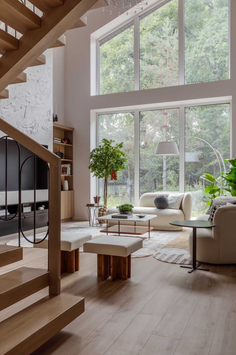Дом в лесу. Современный интерьер гостиной с природными мотивами.