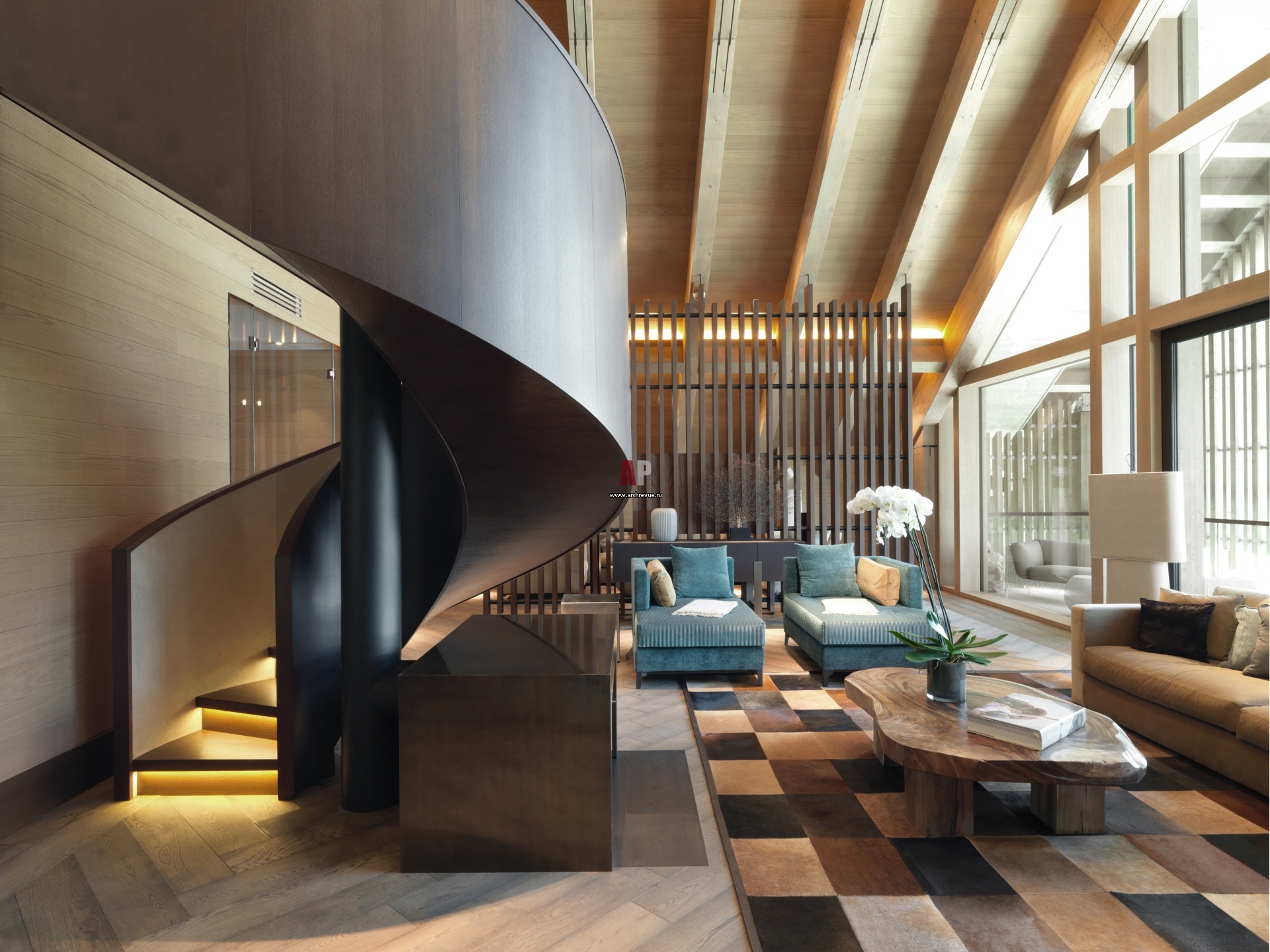Интерьер гостиной с зоной отдыха и винтовой лестницей в мезонин. Снаружи винтовая лестница отделана дубом под венге, внутри — замшей. Пластичная конструкция огибает металлический цилиндр – дымоход камина. Диваны, Meridiani. Журнальный столик из поперечного спила дерева, Concha Bay.