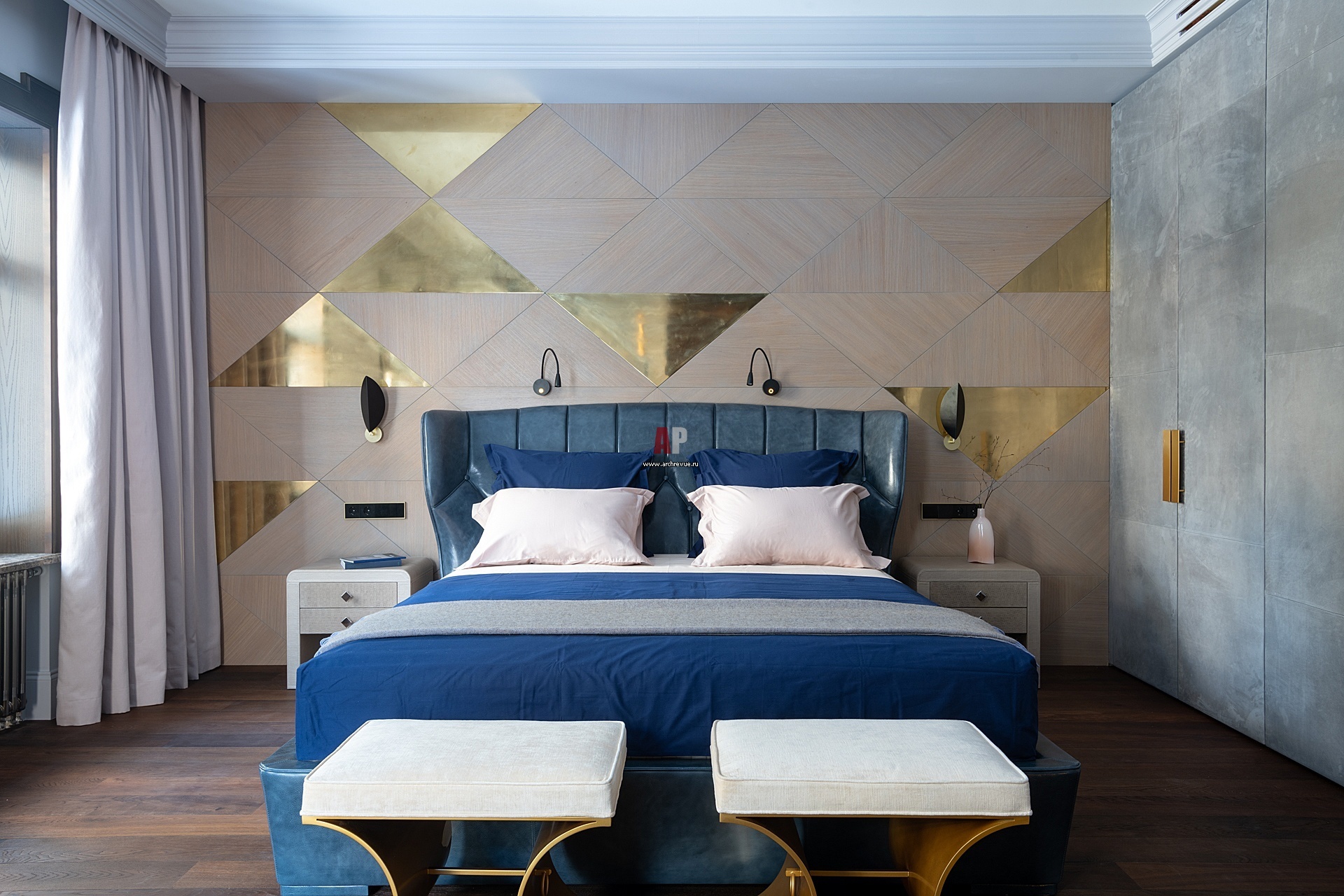 Интерьер спальни на втором этаже. Деревянное панно со вставками из латуни выполнено по эскизам архитекторов мастерами из Дагестана. Кровать, Ulivi Salotti. Прикроватные тумбы, Rugiano. Пуфы, Paulo Antunes.
