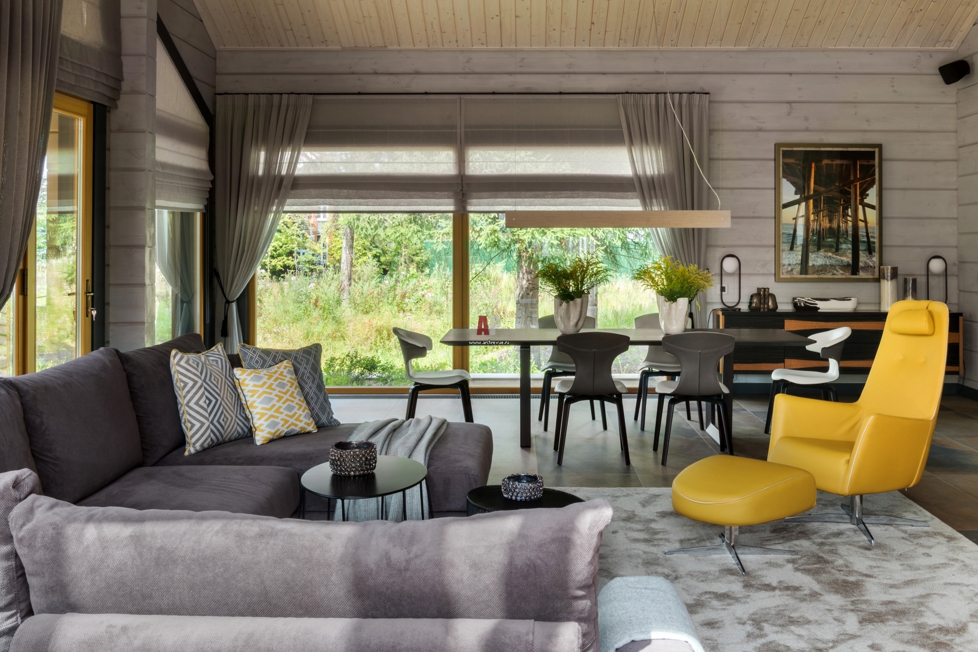 Деревянный гостевой дом со СПА-комплексом в Одинцово. Интерьер общей гостиной выдержан в природной сдержанной палитре.