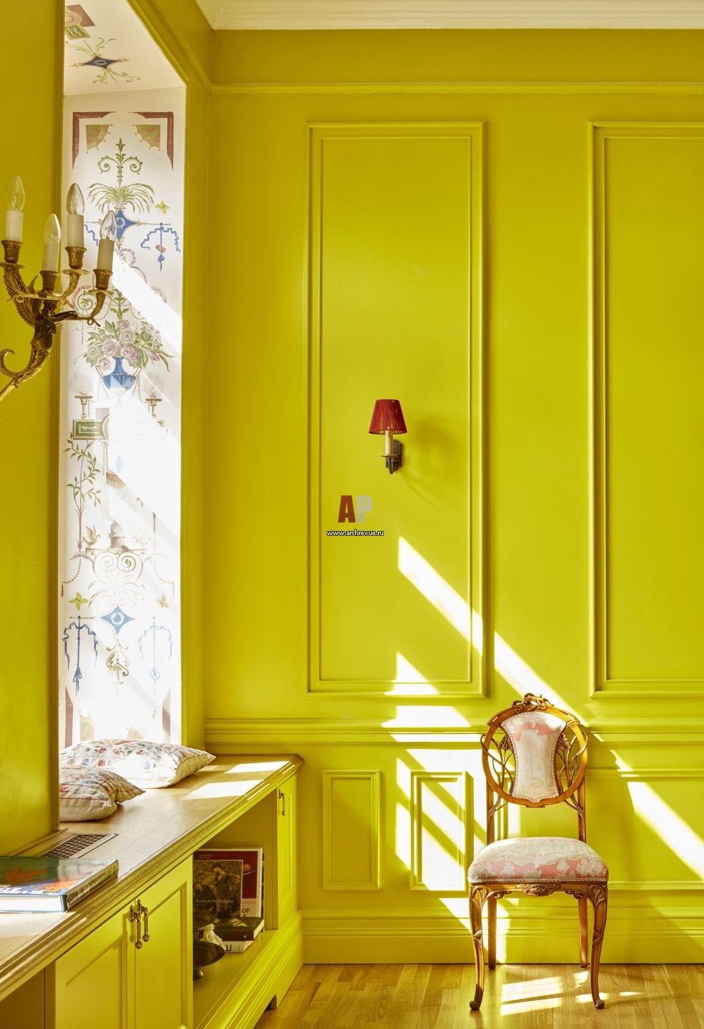 Фото интерьера гостевого зала. Плинтус выкрашен в цвет стен. Оконные проемы украшены ручной росписью.