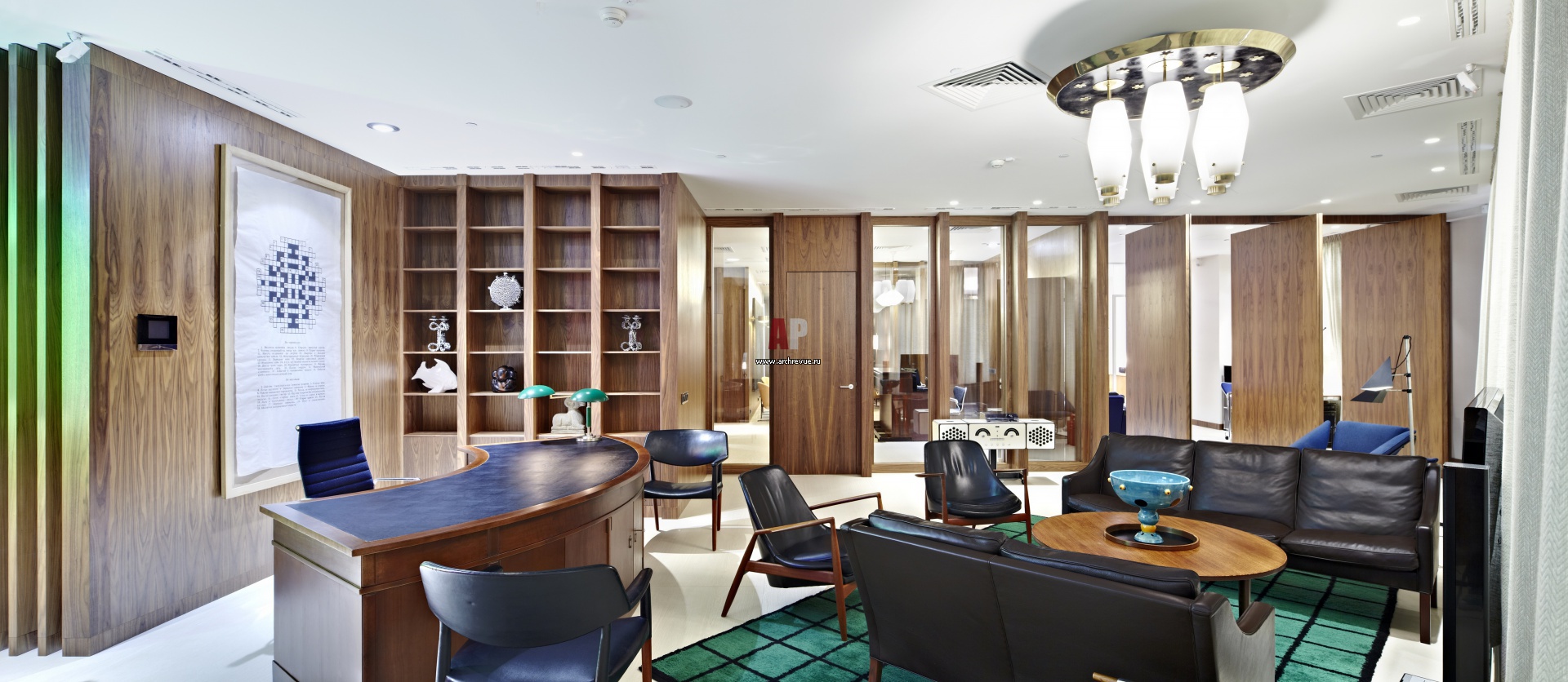 Помещения офиса зонировны системой полупрозрачных внутренних перегородок – конструкций из стекла и вертикальных деревянных ламелий, выстроенных перпендикулярно стеклянным плоскостям. На перегородки-жалюзи из древесины ореха авторов проекта вдохновил интерьер гостиницы «Континенталь», построенной архитектором Джо Коломбо в 1960-х годах на Сардинии.