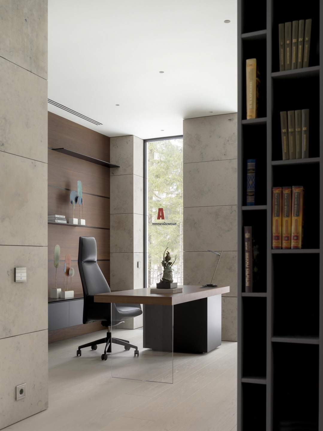 Вид из библиотеки на кабинет. Стены облицованы натуральным камнем с теплой, тактильной фактурой.
