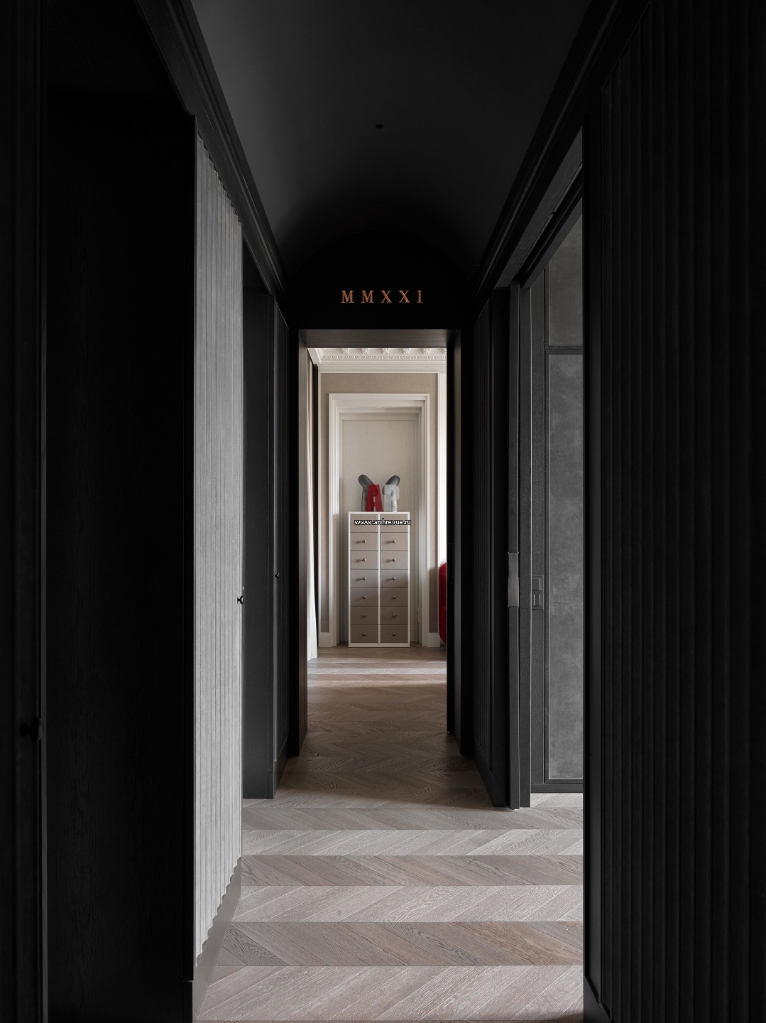 Коридор – парадное помещение с интересными видовыми точками. Рельефные панели, декорированные замшей, скрывают системы хранения. Встроенные светильники, Centrsvet.