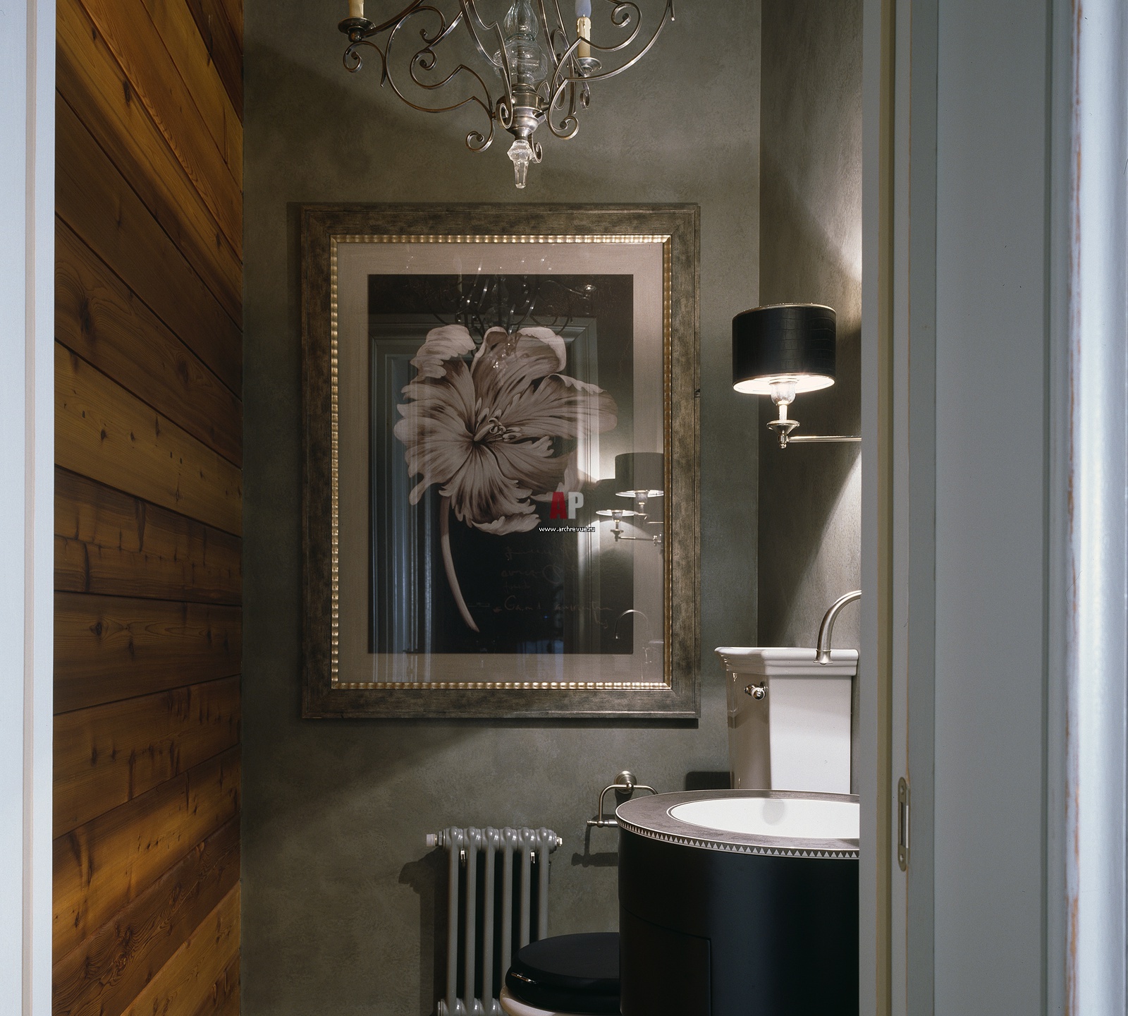 Фото интерьера гостевого санузла. Тонированный кедровый брус – видимая часть конструктива дома гармонирует с декоративной штукатуркой с эффектом натурального камня, поставщик «Дом Краски / Деко – Эм». Сантехника Kohler.
