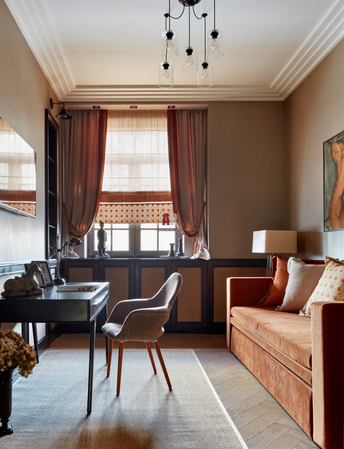 Интерьер кабинета выдержан в теплых, осенних красках. Диван, шкафы, встроенные в ниши, стеновые панели сделаны по индивидуальным чертежам. Тумбы, Eichholtz. Стол, La Fibule. Кресло, Eames.