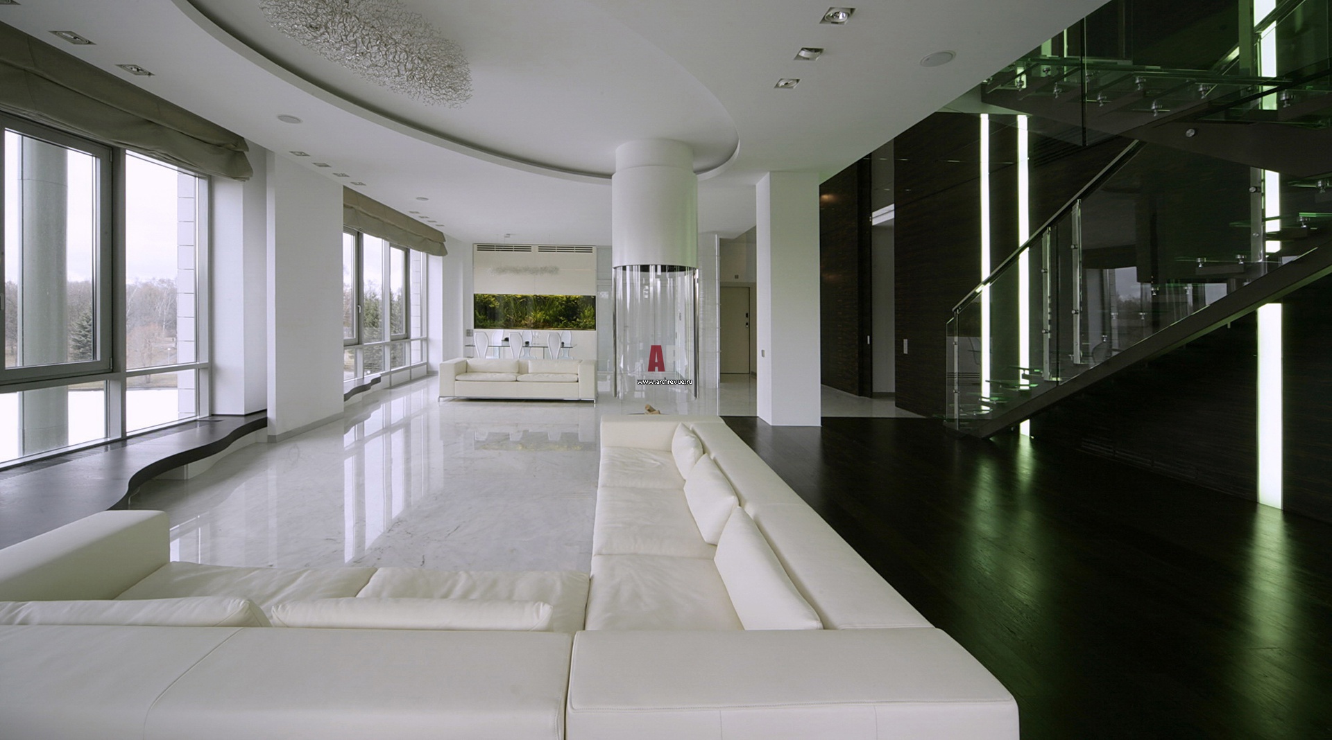 Невесомый интерьер гостиной визуально «держит» 12-тиметровая стена из максара. Через стеклянный камин пейзаж за окном просматривается сразу от входа.