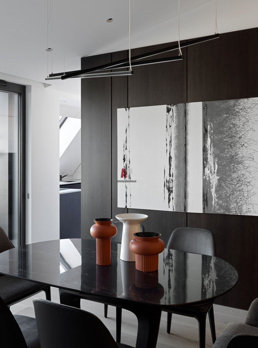 Перегородка между столовой и кухней зашита вертикальными панелями из тонированного в цвет венге дуба.