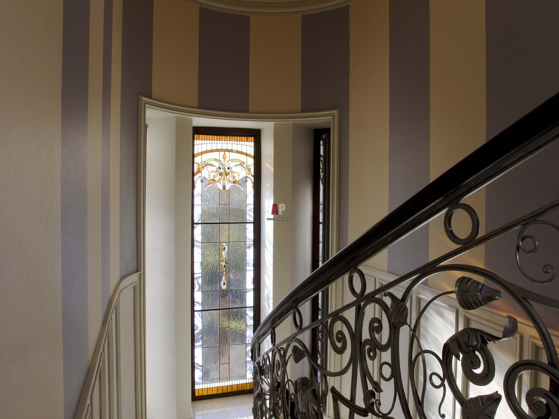 Низ стен овального лестничного холла зашит деревянными светлыми панелями-буазери. Вертикальный витраж и потолочный купол выполнены под проект. Эскизы и изготовление витражей - работа художников Анны Карповой и Андрея Журавлева.